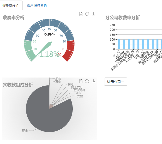 系统专门针对决策层的需求提供各种统计数据及分析图表,企业领导可随时随地查看公司最新营运统计资料,主要功能:按管理区、大楼统计出费用收缴情况,收费率统计,收费年、月、日报表;可分别按管理区、大楼统计出租率;所有统计功能均可生成柱状,饼状及曲线图;