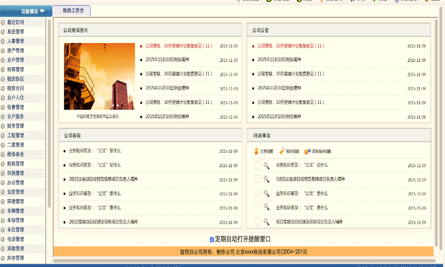 全面的物业管理系统还应该包括楼宇自控系统、门禁考勤系统、停车场管理系统、智能监控系统、安全防护系统、巡查管理系统等的集中后台控制和管理,可以实现通过网通、电信、移动等运营商的短信网关群发短信的功能,以及我们独有的动态、智能工单派发技术等,由于其后端一般均采用统一的计算机网络平台和系统平台技术,因而很容易实现各个系统之间的互联、互通和信息共享。我们可在通用物业管理业务平台技术基础上,针对各物业公司物业管理项目的实际运作模式做进一步的开发和集成工作,并结合数据结构和工作流定制技术,最大程度地实现整个产品的适用性和可扩展性。
