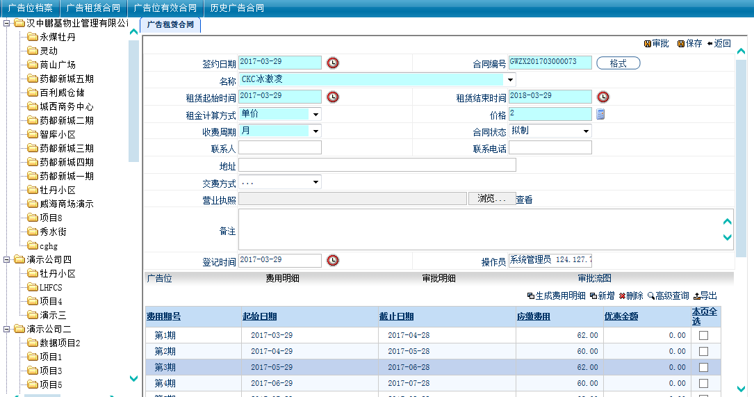 维护车位、广告位信息,签订租赁合同,根据合同生成相关费用,合同提醒,合同到期分析等