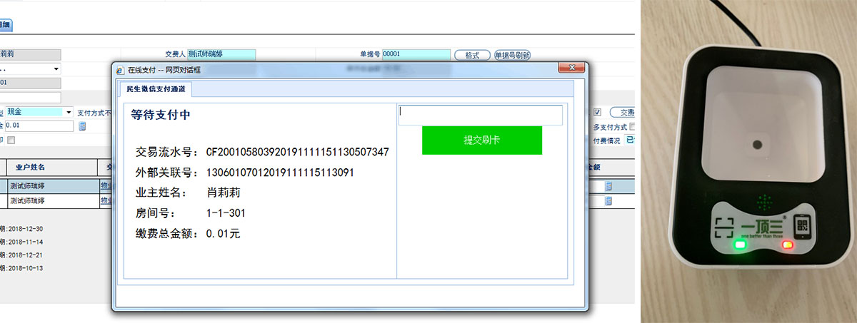 应用场景:业主来缴费大厅缴费,物业人员在电脑上根据业主信息调取业主应收账单信息,选择缴费项目,业主出示微信、支付宝等付款码放置到二维码扫码盒子上方即可进行支付。