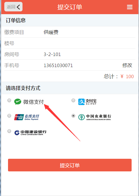 应用场景:物业公司开通微信公众号(服务号或企业号),同时开通微信支付功能,业主关注物业公司微信公众号。业主在家或者自己办公室自助缴费,业主缴纳物业费有两种模式,一种是需要身份验证,也就是必须与通过预留在物业公司的手机号进行验证,证明业主身份后才可以缴费。另一种是无需身份验证,可以随意选取房间缴纳相应的费用。
